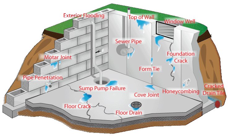 Cracks in the foundation walls or floor will allow ground water to penetrate into your basement, especially when there are periods of heavy rain or when the groundwater level gets high.